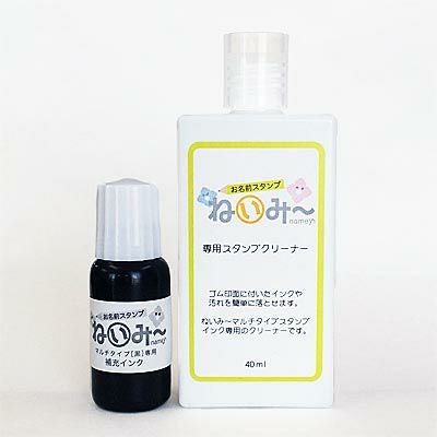 お名前スタンプセット ねいみ~♪ のお役立ちアイテム「メンテナンスセット」 インクが薄くなったとき、失敗しちゃったとき、スタンプパッドの盤面が乾いてきたり硬くなってきたときの為に、念のため買い足しておくと安心です。 ねいみー♪専用マルチタイプ スタンプパッド 黒の補充インクと、ねいみー専用スタンプクリーナーのセットです。